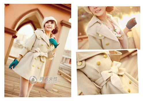 搭配tips:浅米色是最雅致也最保险的选择,双排金属扣更添华丽质感,腰带的点缀很重要,下摆微微展开的设计显年轻,赫本公主式的美丽。