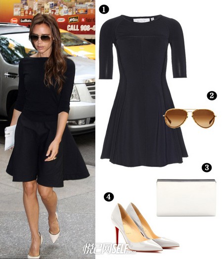 时尚解析:维多利亚-贝克汉姆身穿黑色长袖连衣裙,帅气的黑色和具有甜美风格的蓬蓬裙完美结合,会显得更加女人味,搭配白色手包和白色高跟鞋,经典黑白搭配更显知性优雅。