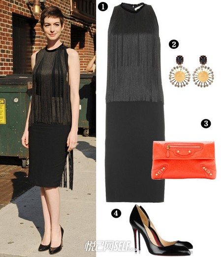 时尚解析:安妮-海瑟薇身穿黑色流苏无袖小黑裙,典雅知性,流苏的设计打破了传统小黑裙的设计风格,更具有垂顺感,突显纤细身材。