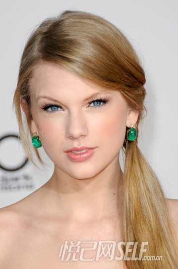将头发低低的扎于一侧,既清爽又浪漫。侧分的刘海让脸型看起来更加柔和。金色发色也衬托出泰勒白皙的肌肤。