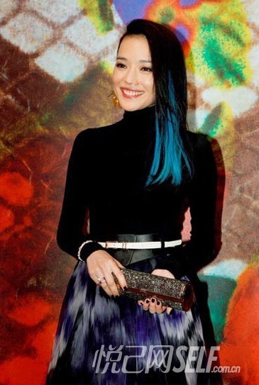 把头发全拨向一边的造型特别时尚。在黑色的头发里挑染几缕蓝色更是个性感十足。不愧为舒淇是时尚范儿!