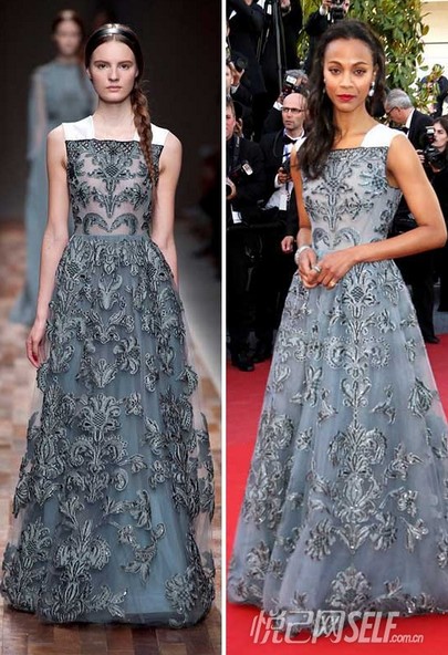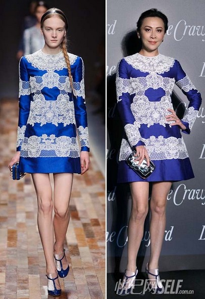 刘嘉玲。立体的蕾丝刺绣使整体剪裁不显单薄,华贵亮眼的宝蓝色,衬出好肤色更提升气质。
