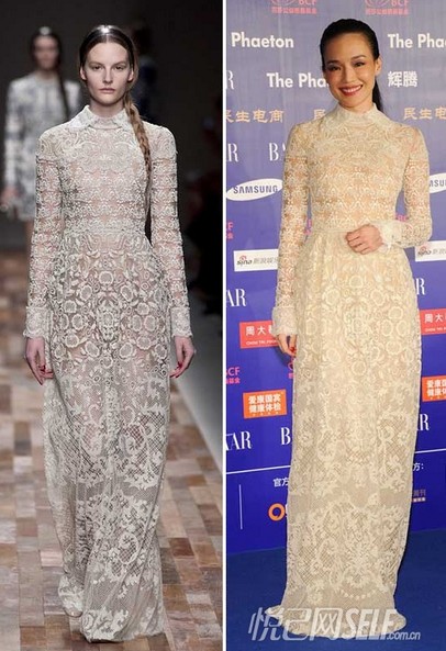 舒淇。以柔和的乳白色,衬托出穿着者的清雅纯洁,半透明的蕾丝刺绣也不会显得过于性感突兀。