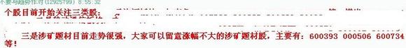 对个股,早盘推荐注意的三个板块都是低开高走,涨幅都不错,特别是涉矿题材板块的600393由低开2个多点到盘中攻击涨停,如下: