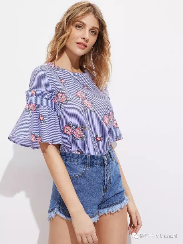 圆领的上衣也很适合肩宽女生,另外花朵刺绣图案能吸引住别人的视线,遮盖上身本身的缺陷。