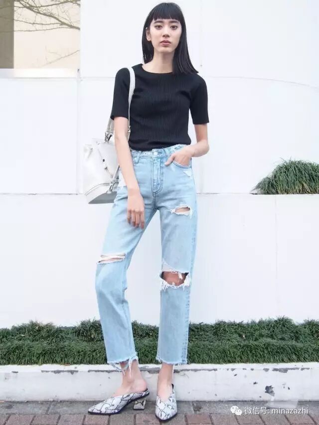 高腰直筒裤很好的修饰了腿型,破洞的设计时髦抢眼!