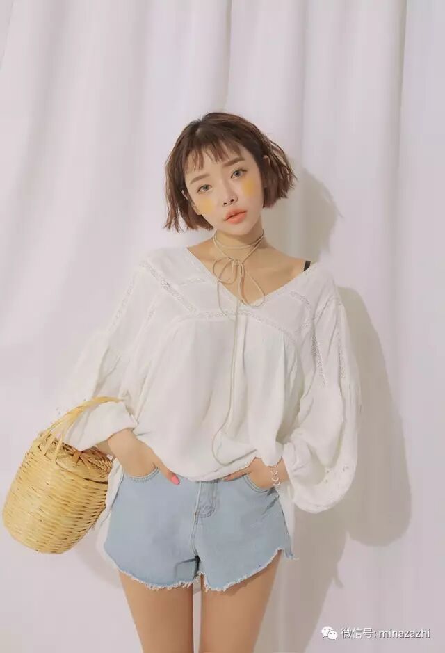 V领的罩衫能够遮住肩膀宽的劣势,再加上宽松的材质也能遮盖粗手臂,下身搭配牛仔热裤,这样整个人也会显得很精神!