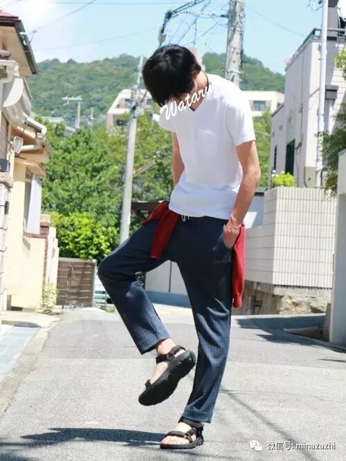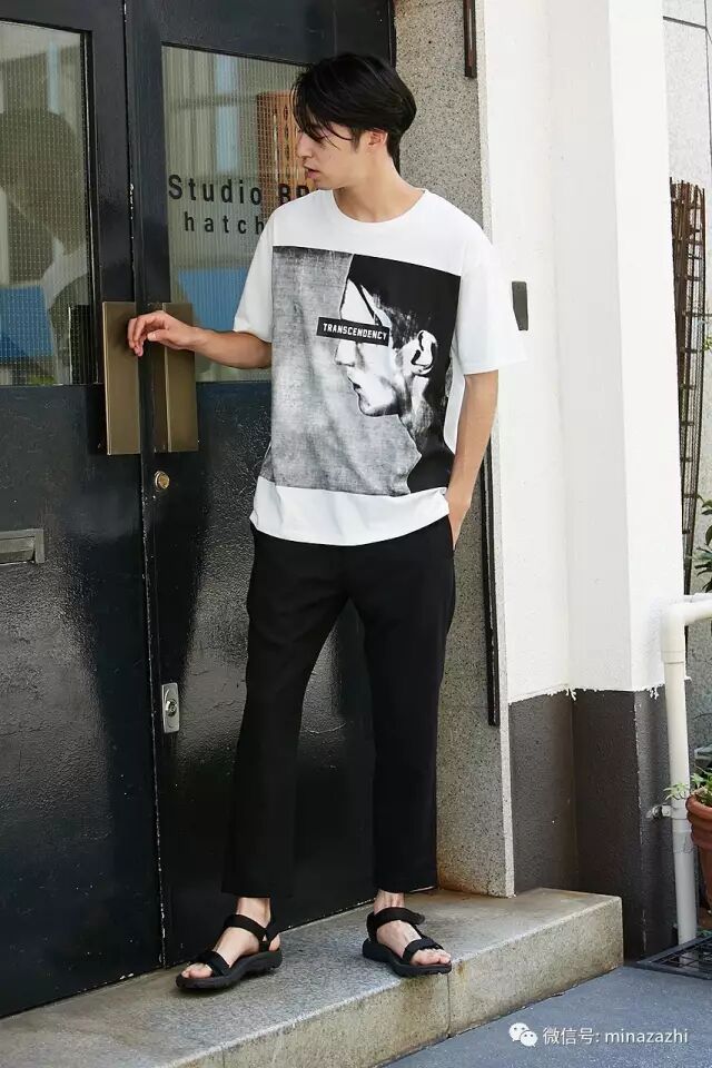 大大的照片印花T也是比较常见的T恤款式,黑白老照片自带复古迷离的感觉。搭配黑色裤子和凉鞋在色彩上非常和谐。