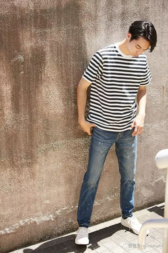 简单的条纹T略微贴身,可以把健壮的手臂和上身肌肉刻画得若隐若现~非常迷人!搭配简单的牛仔裤就够帅了!