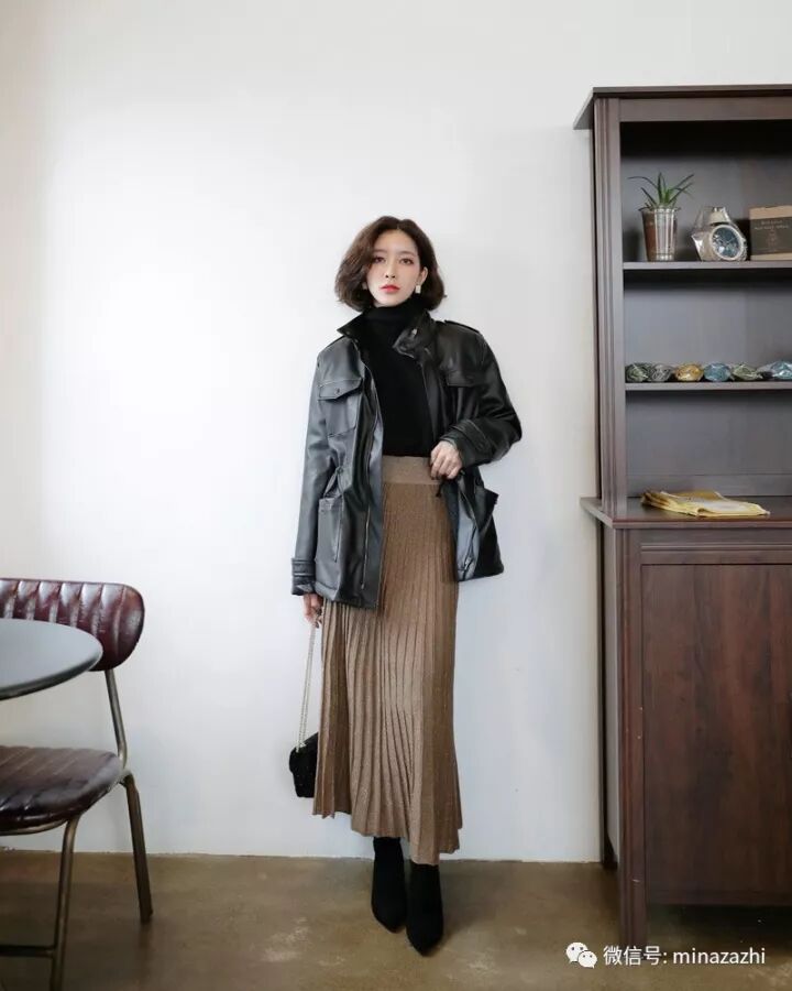 浅色皮衣在视觉上更加柔和,和冬季的长裙搭配反而少了一丝冷漠,修饰了中性感!参考价:755元。