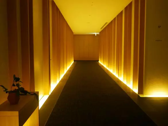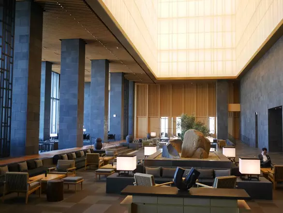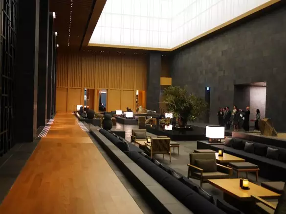 抵达33楼大堂首先是微笑和热毛巾相迎,工作人员都是黑色制服,融合了禅意的小棉袄,接着是巨大的盆景和高达33米的挑高的屋顶,日式灯笼和纸设计在光的配合下震撼的出现在你头顶,整个设计长40米宽11米,由层层相叠的纹理和纸经由日式木框延伸,由大楼中心贯穿所有六个层面,不远处巨大的落地玻璃将整个大堂的气氛马上拔高了起来,反正还没进房间门就嗨了!
