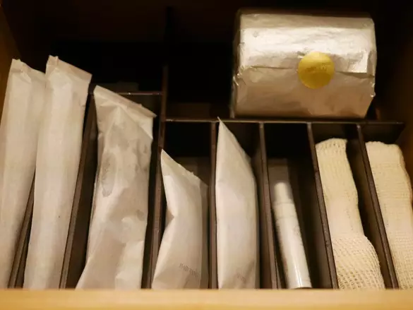沐浴露是自家产的,而洗漱用品分类非常齐全,厕所隐藏在洗手台边上,很喜欢这种洗厕分离的方式,浴缸边上还有传统和式木盆。