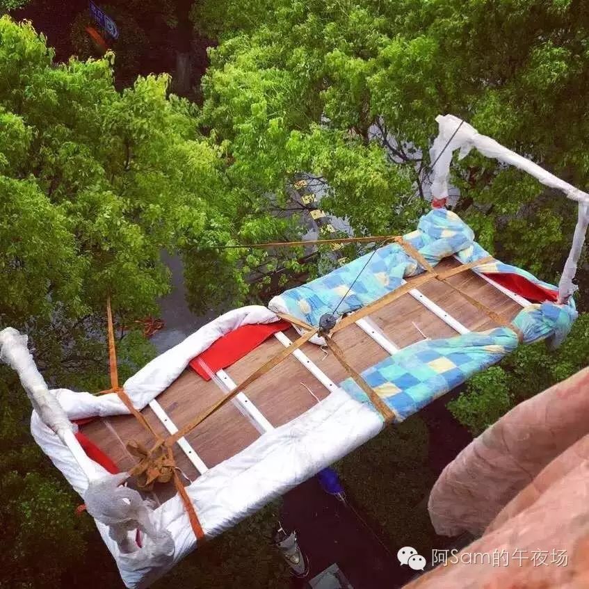 前段时间订做了一张大木桌,因为设计的时候太大,运了一两周硬是没弄进家,最后只能吊车吊进门,然后我发了一条朋友圈:“这个桌子只能空降了”!图片在下面。