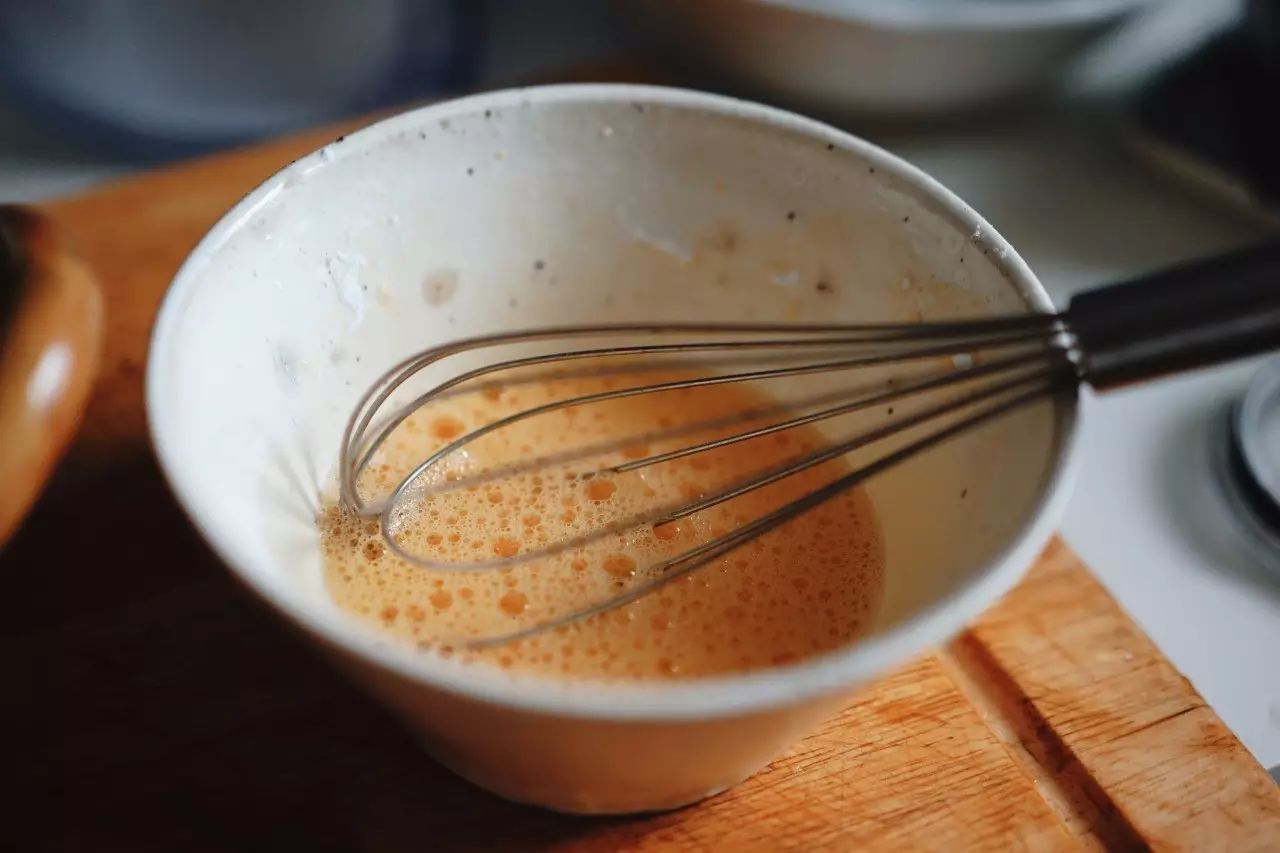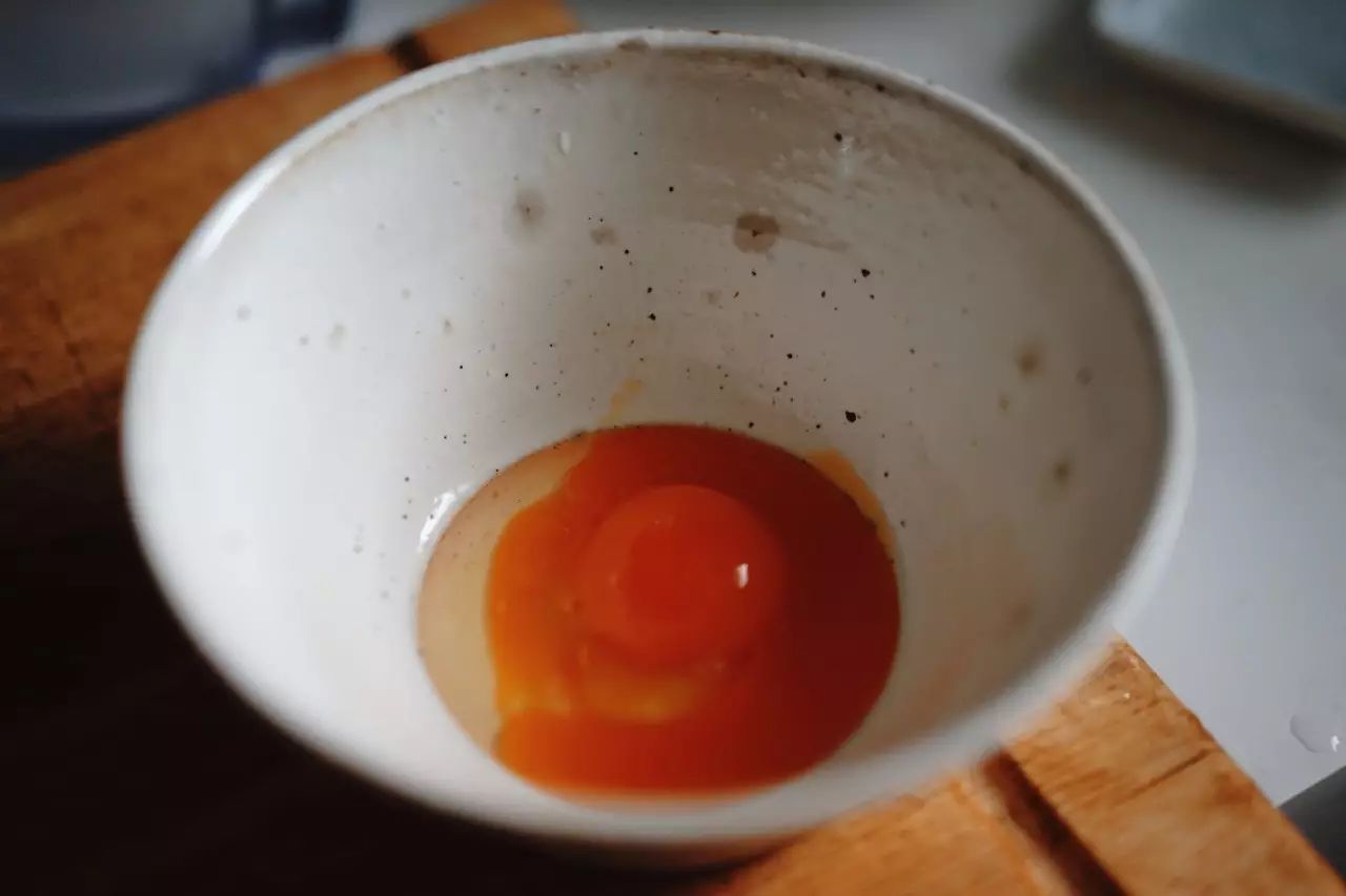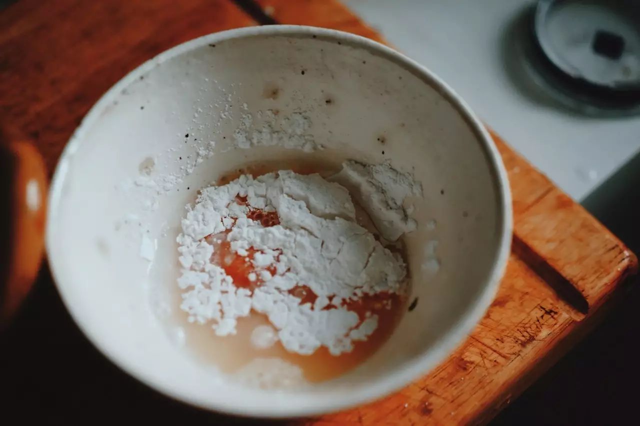 取鸡蛋黄加入少许淀粉,然后充分搅拌。