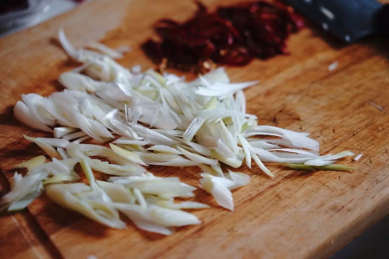 将莲藕切成条状或者丝,大葱和干辣椒也是全部切丝准备。