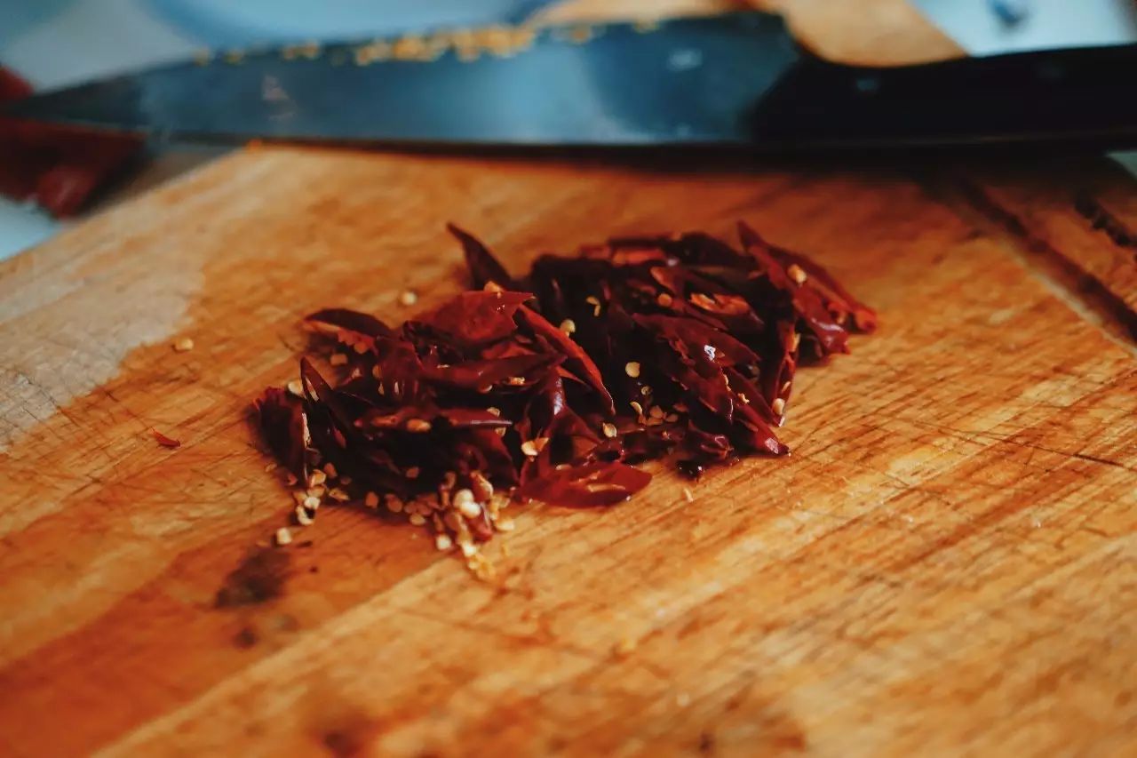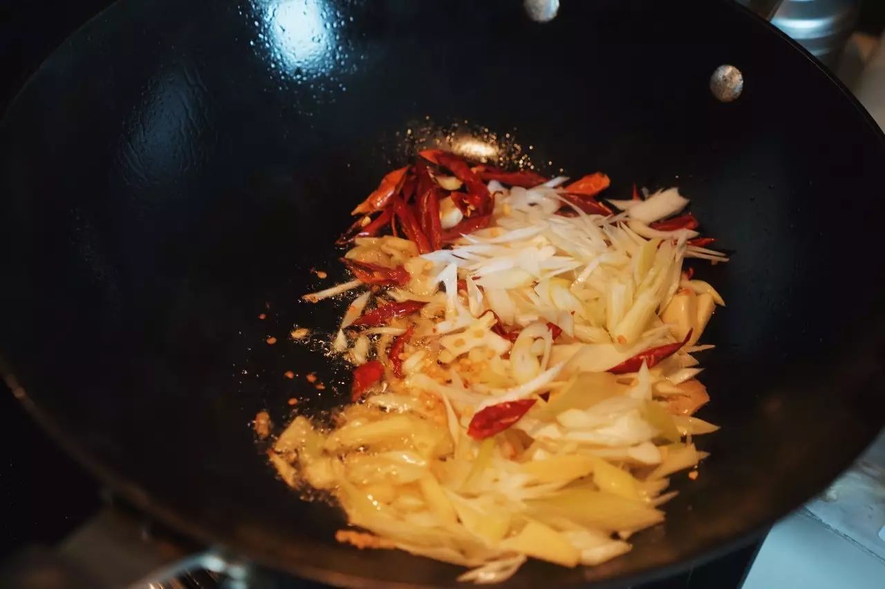 将切好的大葱,生姜和干辣椒一起丢入锅内爆香。