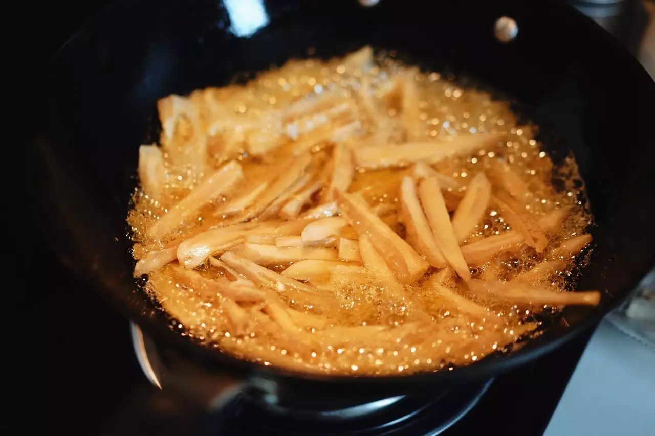 倒入已经炸好的莲藕条煎炒,一直把锅内的油和水煸干为止。