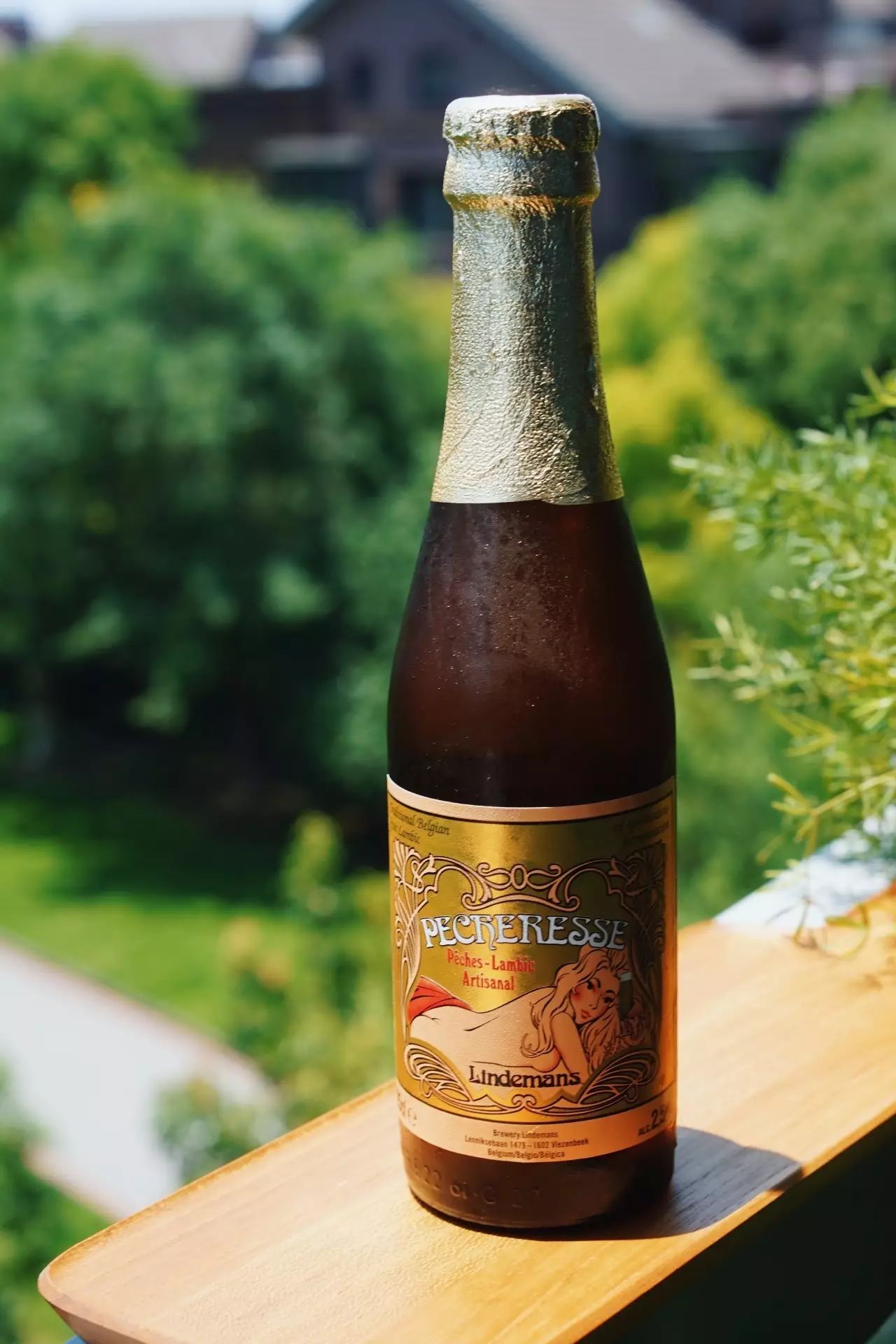将自然发酵了6个月的拉比克啤酒木桶中加入水果原材料,再经过一年左右的发酵才算告成,每瓶桃子啤酒中都至少含有30%的桃子浓缩提取汁进行酿造口感醇美,有点香槟的意思,并且香味十足。