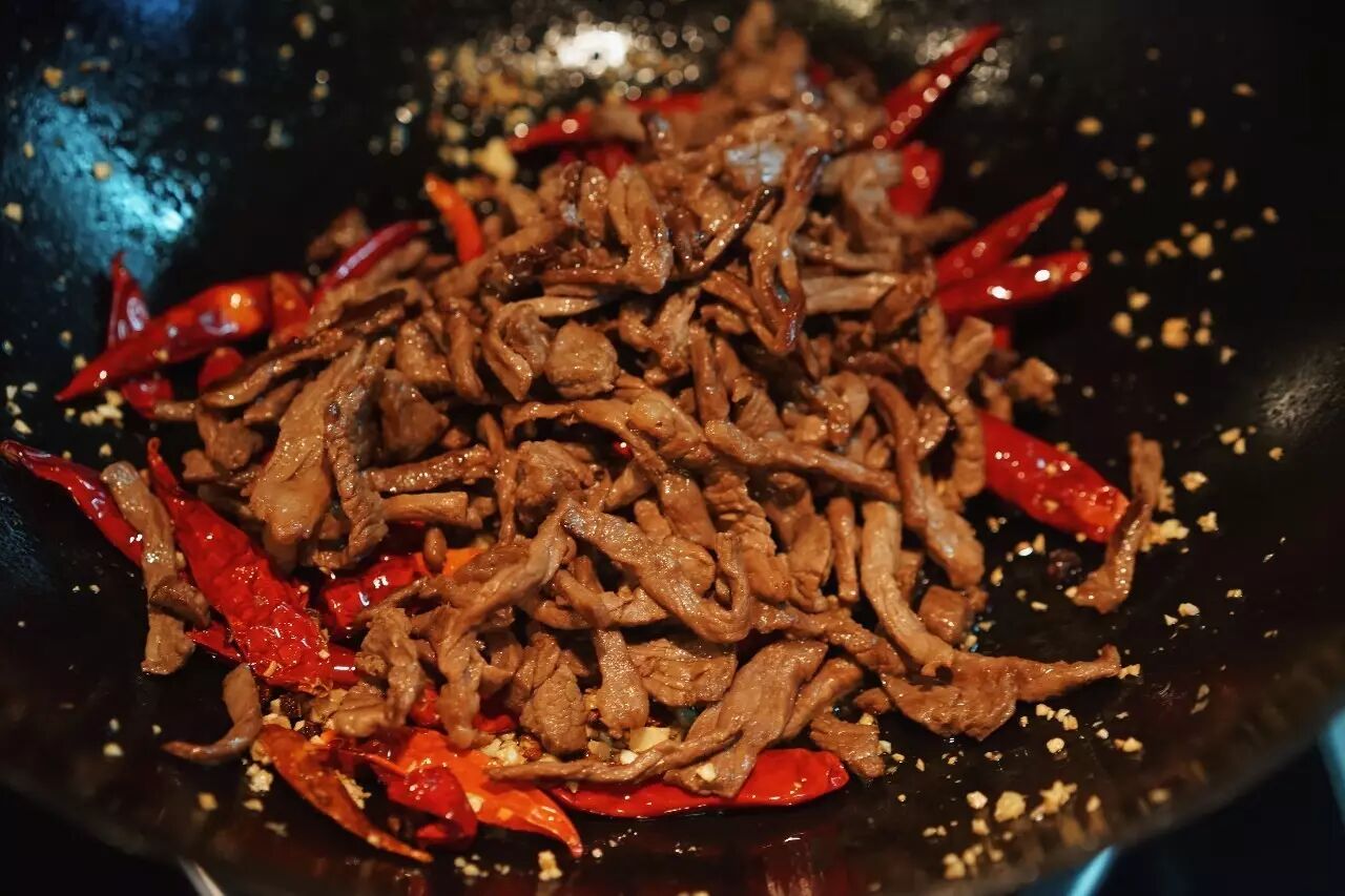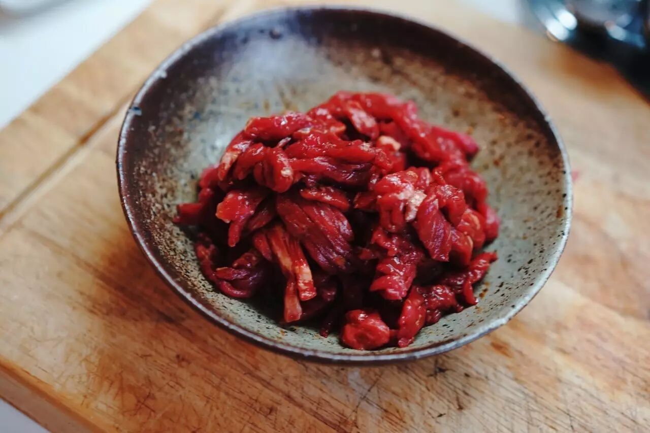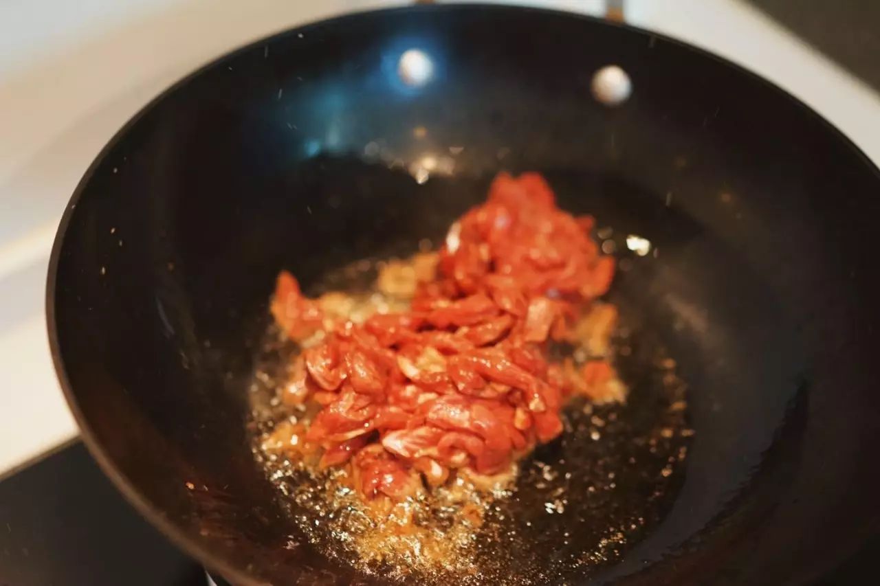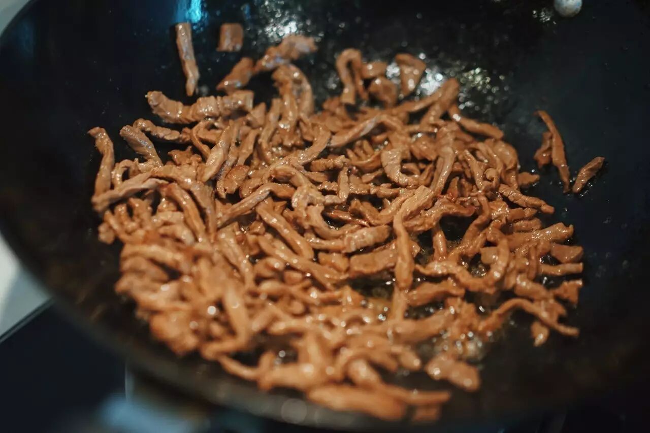 倒入少许色拉油,大火将油烧滚来干煸牛肉,倒入腌制好的牛肉丝,在煸的过程中牛肉会出很多水,大概需要倒两次水。