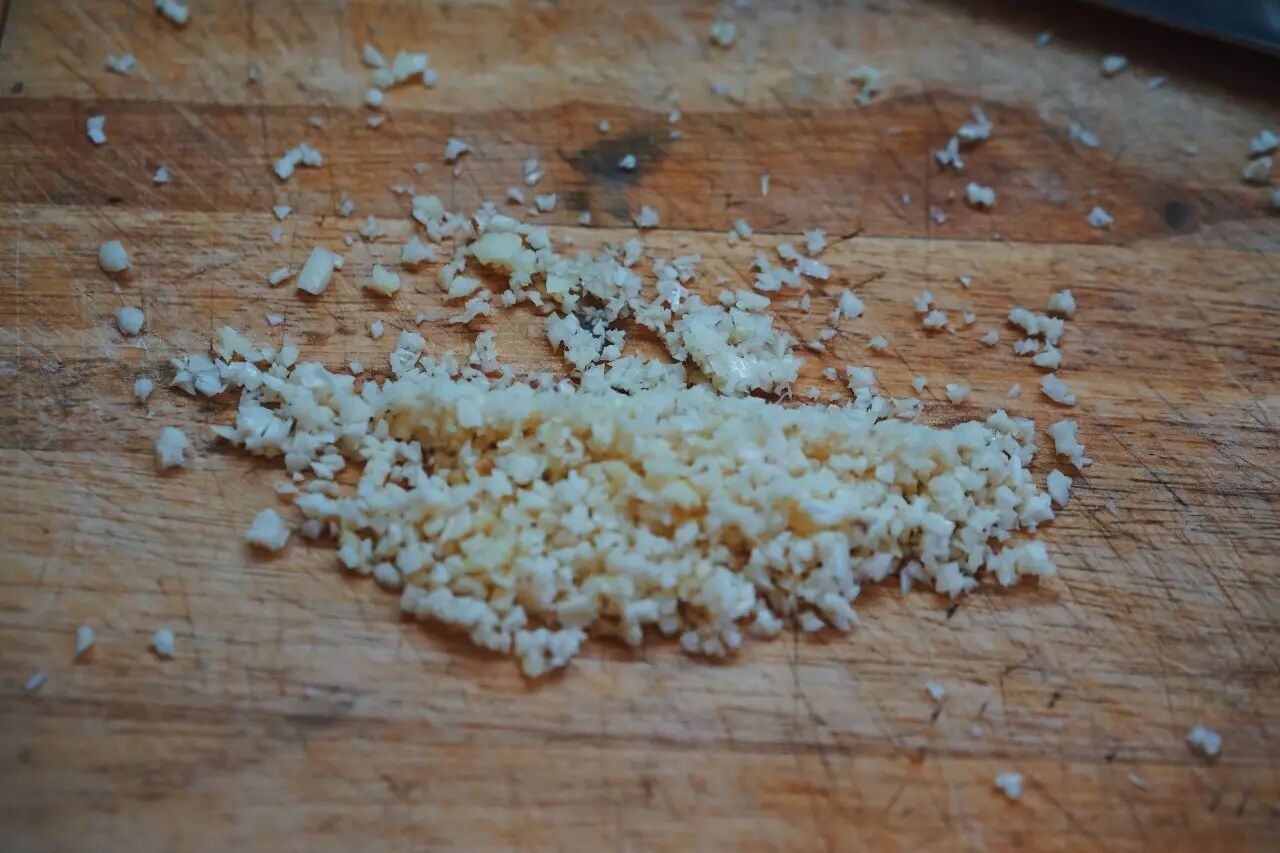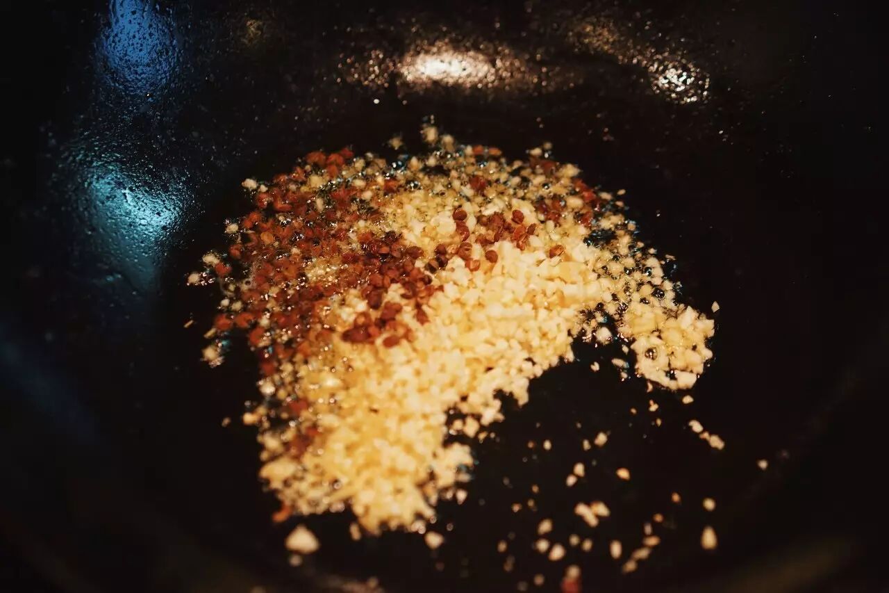 大火爆油,将切好的蒜末下锅,翻炒至金黄色。(也可加入少量花椒)