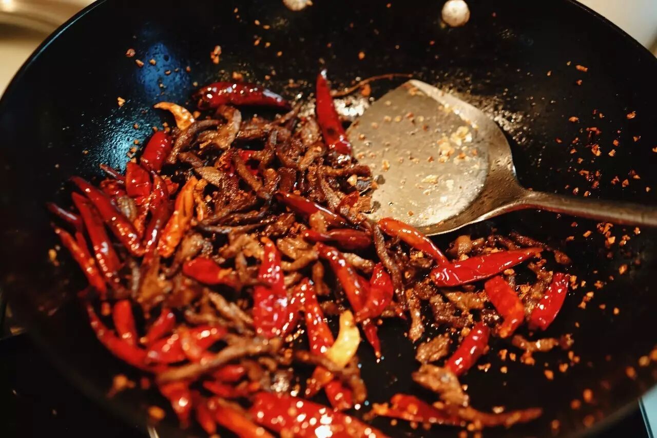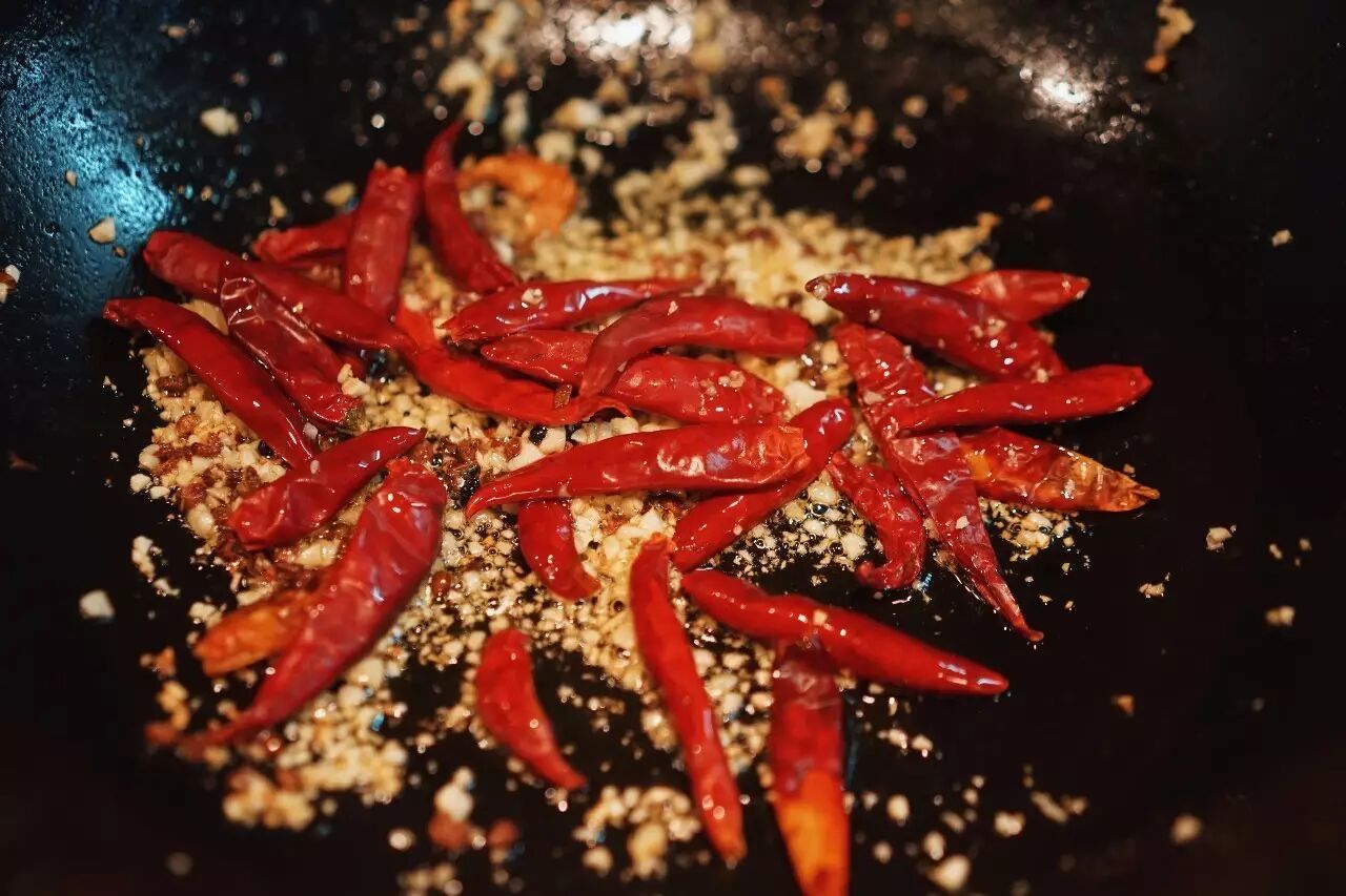 转中火然后再放入干辣椒,(一定不能超过中火,不然干辣椒会变黑)将蒜末与干辣椒充分混合。