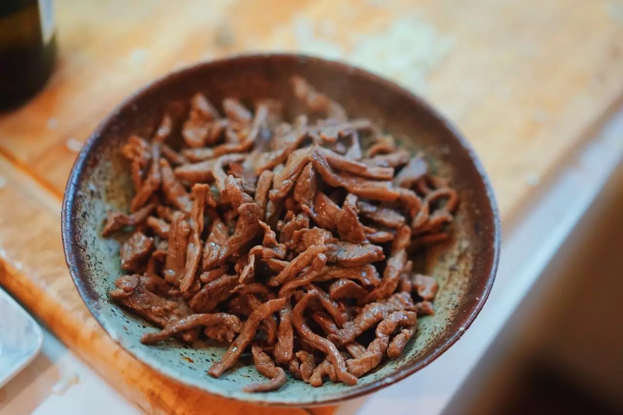 好菜肯定要配好酒,今天的酒也比较特别,因为牛肉丝比较辛辣回味,搭配一款口感醇厚的精酿啤酒刚刚好,啤酒也是我的好朋友九寸金钉自己手工酿造的,他的主要工作是摄影师和工程师,不过现在多了一个身份酿酒师,之前去北京他刚好是我的摄影师,送了一瓶给我简直有种震惊的美味。