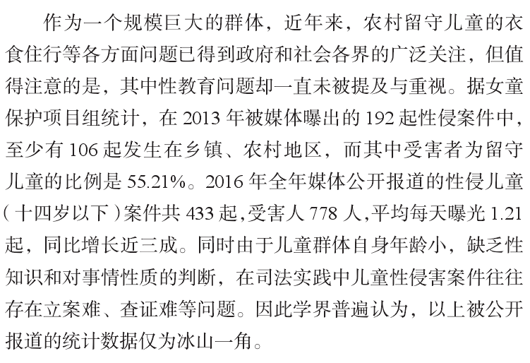 国家从改革开放以来,颁布了涉及性教育内容三十几个政策法规文件。下面划分了三个阶段。第一个阶段,面向生理知识的性卫生教育(1978-1994),第二阶段是面向社会问题的性健康教育(1995-2006)和面向性关系的性安全教育(2007-2016年)。2008年教育部在颁布的《中小学健康教育指导纲要》中,明确指出要把性教育纳入健康教育的框架。2011年,在《中国儿童发展纲要(2011-2020不安)》中也明确规定,要将性欲生殖健康纳入义务教育课程体系。由此可见,国家对儿童性教育是持支持态度的。既然国家大力支持,还是频发留守儿童被性侵的案件。