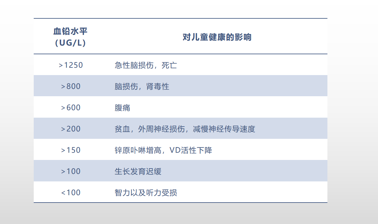 随着科研的深入,铅对儿童健康的伤害越来越被我们认知,通过研究发现,血铅在非常低的水平就会儿童健康造成影响。美国CDC公布的数据显示,在美国约250万1-5岁的儿童超过CDC公布的诊断铅中毒最低标准100UG/L 。
