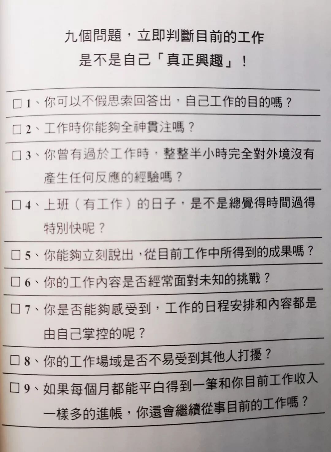 书中提供了9个问题来进行自我探索,如果6个以上问题回答都是肯定的,那说明你现在做的工作十有八九是你自己感兴趣的。