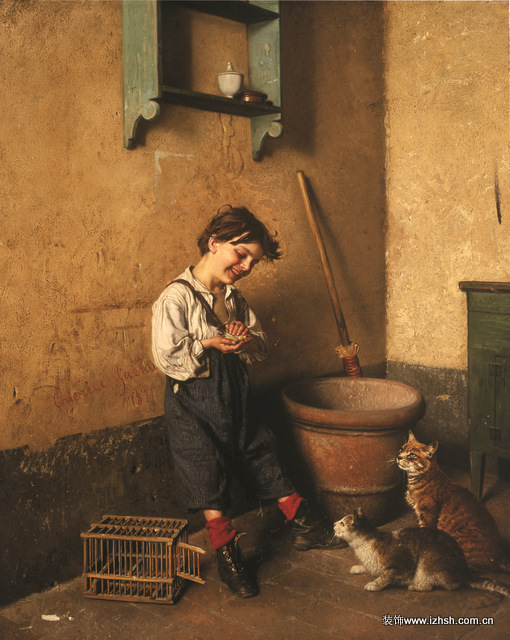 意大利画家基耶里奇是一位现实主义的风俗画家,其画风接近19世纪六十年代晚期意大利反学院主义革新运动的艺术群体---马基亚约利画派。这幅作品与一旁的《忧伤》有一种情节上的关联,共同讲述了一个小男孩与小鸟、小猫的故事