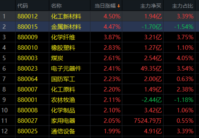 从行业板块涨跌幅排行来看,两市唯有【保险】板块下跌,其他板块均上涨,其中【金属新材料】【化工新材料】涨幅居前,概念板块中【半导体】【稀土永磁】领涨市场。