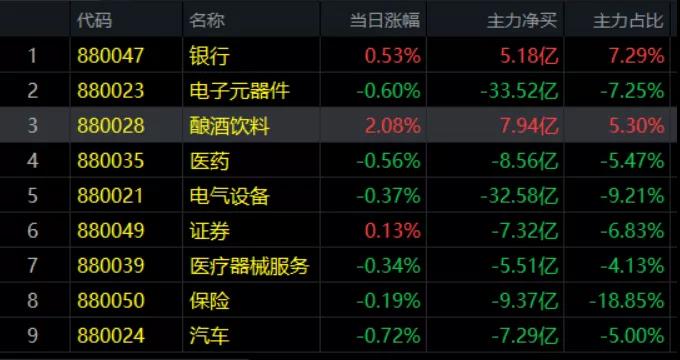 从行业板块市值排行榜来看,今天【酿酒饮料】板块涨了2.08%,【银行】板块涨了0.53%,这对于稳定当前的指数下跌是非常有价值的,前九大市值的板块仅有三个是红的,其中【证券】板块的资金还是净流出的。其中净流出最多的是【电子元器件】和【电器设备】都在30亿以上!