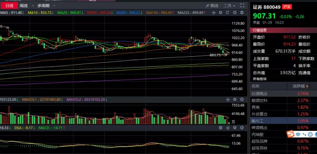 目前【证券】指数已经回踩了233日均线,距离前高点到现在调整了半年多的时间,调整到了前期涨幅的半分位的位置,也就是说这个233日均线的支撑非常重要!从时间和深度上来看都到了一个临界点,那么之后后续这个板块能否继续起到变色龙的作用,我们就继续观察好了!在这个市场上,时刻提醒自己摆正自己的位置,做自己能看懂的交易,做自己能负责任的交易,在保护好本金的前提下思考如何获利。炒股说难很难,说简单也就是这么点事!