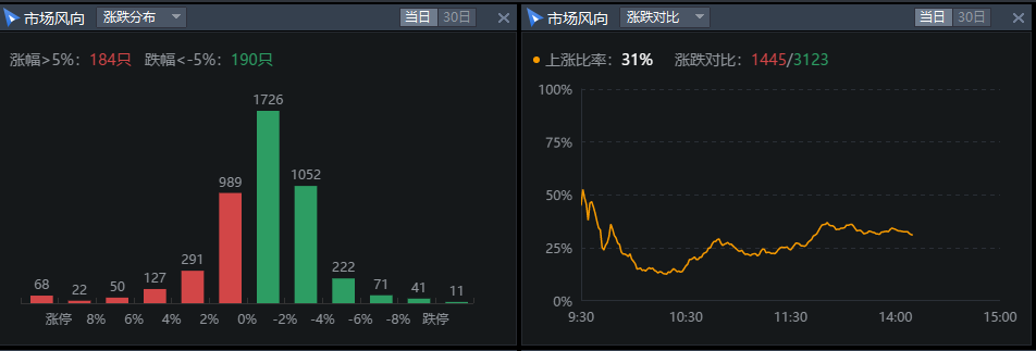 今天市场波幅较大,盘中指数可能没有跌多少,但个股却很可能表现极差。在上午行情中,市场上涨比率甚至曾出现过13%低值,这种行情对于炒股的人来说太难了。其实指数早已经不能反应市场里真实的情况,大家在参与市场时一定要以个股的技术面情况为准绳才能不被迷惑。