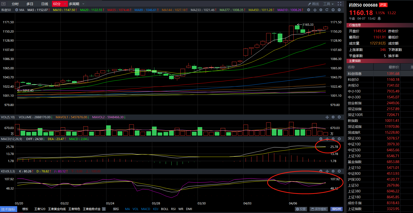 但是也要注意,攻防兼备,目前科创50指数60分钟图已经出现将要指标双死叉的态势,那么也就是说短期科创50指数存在着超买的这种现象,有阶段调整的可能。所以大家如果考虑做指数ETF和相关品种的时候,一定要注意禁止追高,等回调再说。整体上我们对于指数来讲,短线继续看多