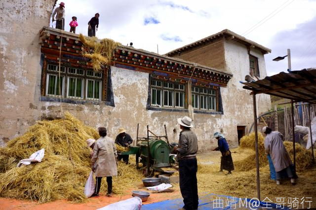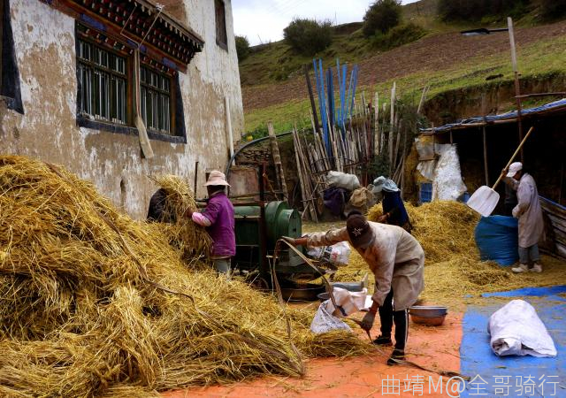 到达村中的一块平地上把车停好,带上相机沿小路往村子的高处攀爬。没有见到人,旁边一座藏式民居,高大厚实的院墙,也看不见房屋内部的情况,几块不大的土地上,播种的青稞已经收割干净。这时听到更高处的一个院子有机器声响起,还有人说话的声音。再往上,就看到了院子里很多人,在用脱粒机打青稞,男女老幼十几个人,热热闹闹的干活,几个孩子在其中,大点的在劳动,几个小的在院里中玩耍。