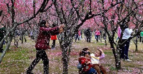 近日,福州国家森林公园,5名游客带4个小孩赏花。为拍到桃花雨,大人使劲摇晃树枝,大量花瓣随之飘落。小孩们也学着摇晃,甚至掰断了一根树枝,家长却没责备。有游客上前阻止,家长说:花总是要落的。