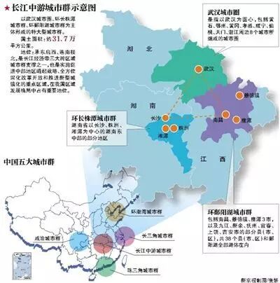 4月16日上午,国家发展改革委政研室主任施子海在解读《长江中游城市群发展规划》为主题的新闻发布会上,再次明确了长江中游城市群是以武汉城市圈、环长株潭城市群、环鄱阳湖城市群为主体的特大型城市群,涉及到三个省、31个市,国土面积31.7万平方公里。