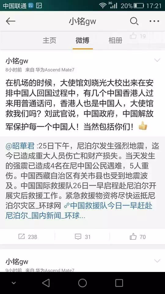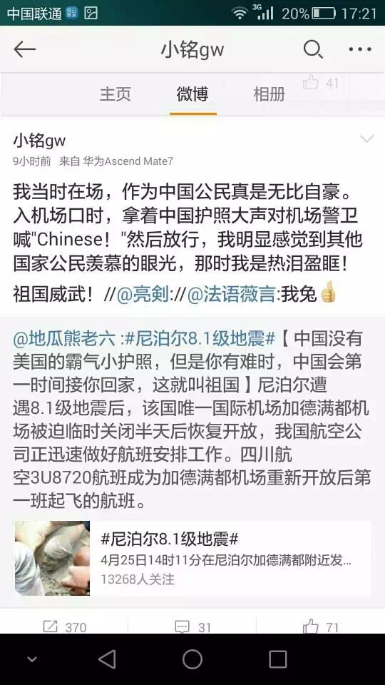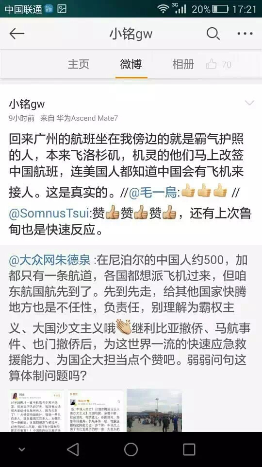 ........我想每一个中国公民都希望,祖国就应该这样强大下去,但是我也想,对祖国的认同,更应该从接受海外救援时的理所当然,延伸到成为与祖国共同面对其他挑战时的心心相映。面对自己的祖国日渐强大,我们除了点赞,更多的也要成为共同建设和维护这个国家的人。