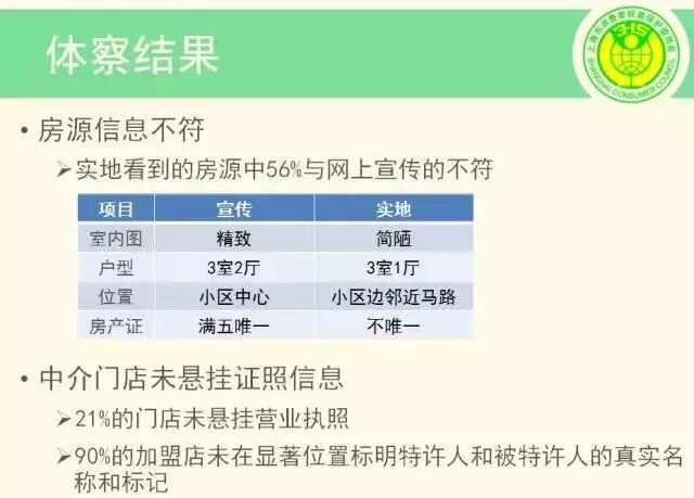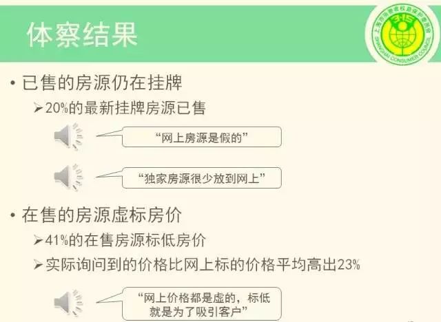 数据显示,有20%的已出售房源仍被中介挂牌用来招揽客户,41%的在售房源存在标低房价的现象,最终实际询问到的价格比网上标注价格平均高出近2成。此外,还有56%的房源在实地查看时与网上宣传不符。