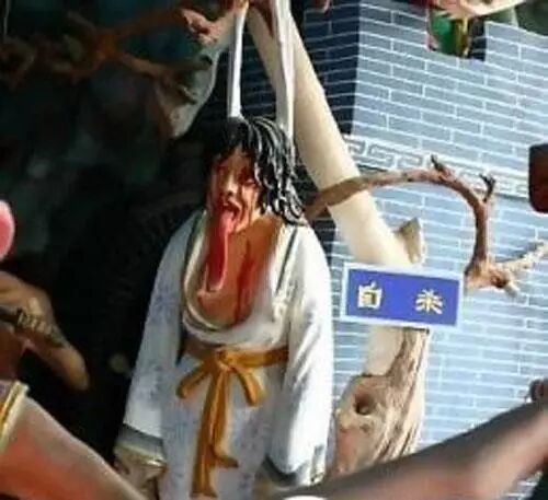 中国人的绞刑是用弓弦缢杀……就是把弓套在受刑人脖子上,弓弦朝前,行刑人在后面开始旋转那张弓,弓越转越紧,受刑人的气就越来越少,最后终于断气……岳飞父子就是这样死在风波亭,(因为他是功臣,不能斩首,要留全尸)而明末流亡的桂王也是这样给吴三桂亲手缢杀……