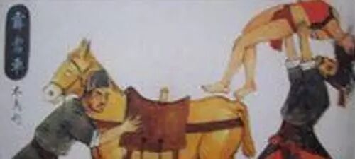 http://mmbiz.qpic.cn/mmbiz/8hCQFZTbeAjp2OiaNicictQJ5UqEhxxmFf06878GptGdibEwXicgibib738deel2NOuG6iaY2hWqdSic2EiaT4qSBIS9kPaw/640?wx_fmt=jpeg&tp=webp&wxfrom=5&wx_lazy=1即五马分尸,很简单,就是把受刑人的头跟四肢套上绳子,由五匹快马拉着向五个方向急奔,把人撕成五块,因为作为头是最先掉得,其次就是双臂,等只剩双腿连着躯干的时候,拉力会拉断其中一条腿,躯干就会留在另一条腿上。不过根据了解的说法来看,不一定肢体就会从既定的部位断掉,因为手腕和脚腕都比根部脆弱得多。记得商鞅就受过车裂之刑,不过是在他战败死后,尸身被带回处以此刑示众。