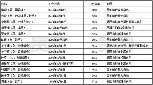 据不完全统计,近年来内地及港台地区因抑郁症自杀的艺人名单