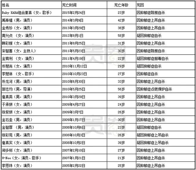 据不完全统计,近年来因抑郁症自杀的韩国艺人达21名,其中11人在去世时还不满30岁