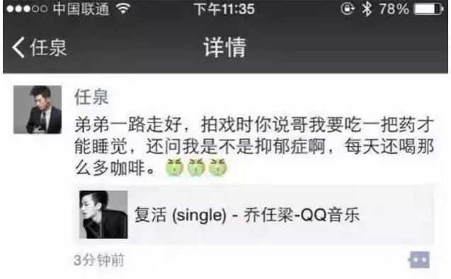 他昨晚在朋友圈透露乔任梁拍戏时需要吃安眠药才能睡觉,还问任泉这是不是抑郁症…