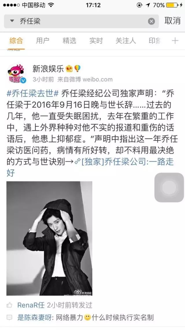 微博是个乌烟之地,但也不乏理性和关爱。乔任梁去世后,他的圈内好友纷纷发文哀悼。