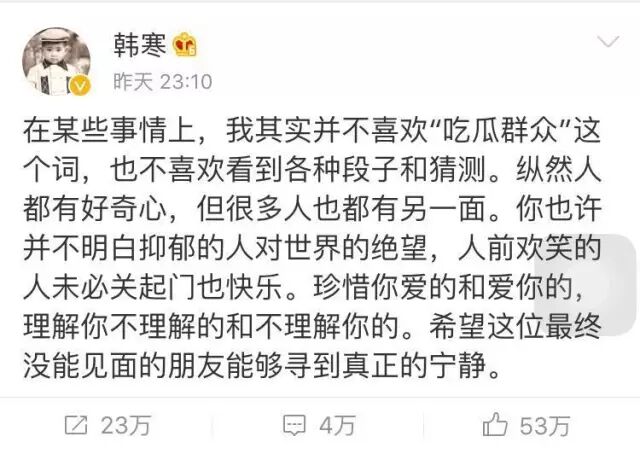 昨晚韩寒在微博上说:你也许并不明白抑郁的人对世界的绝望,人前欢笑的人未必关起门也快乐。珍惜你爱的和爱你的,理解你不理解的和不理解你的。希望这位最终没能见面的朋友能够寻到真正的宁静。