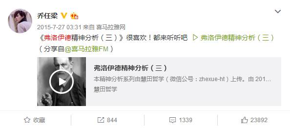乔任梁的微博显示,他在2015年曾经关注过弗洛伊德的精神分析。