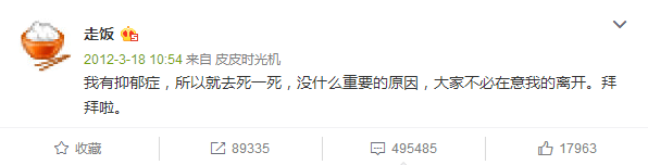 “我有抑郁症,所以就去死一死,没什么重要的原因,大家不必在意我的离开。拜拜啦。”2012年3月18日,网友“走饭”通过定时发送工具将生前的最后一条微博发到了网络上。