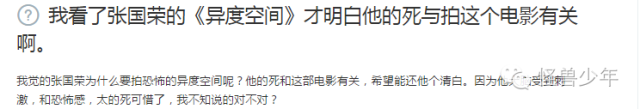 这不禁让人想起了2002年的电影《异度空间》,当时有传张国荣因为拍摄该片而患上抑郁症,2003年4月1日跳楼自杀身亡。